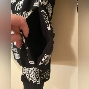 Two pockets on either side. Nice quality materiel, comfortable and quality thickness. Crewneck design. See photos for various logos on sweatshirt.