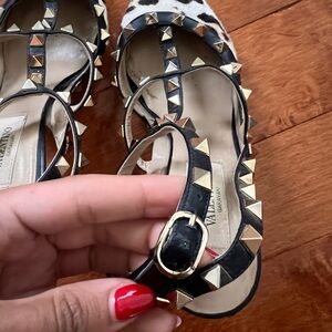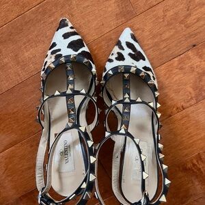 The most comfortable heel you’ll wear! These Valentino Rockstuds feature leopard pony hair - a fun add on to any outfit. Super minor signs of wear on the exterior of shoe. Comes with dust bag. Size 36.