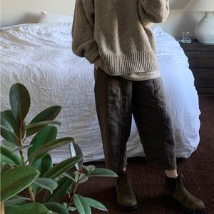 Color is called kangaroo. Purchased on Etsy, ended up needing a different size, never worn. Women’s XS, please see brand size chart on Etsy for best fit. NotPerfectLinen, Linenfox, Elizabeth Suzann. Retails for $92+tax and $15 shipping on Etsy. Approximately 11” across waistband unstretched. 14 3/4” rise, 22” inseam.
