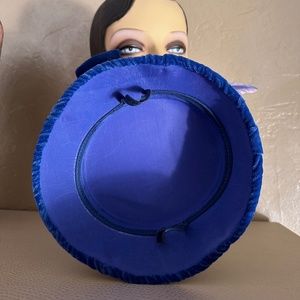 This stunning hat from the elegant 1950s' consists of a flat crown plus a round brim. The structure is covered in royal blue velvet fabric which is draped over the brim. Around the crown there is a purple satin fabric band that ties a blue velvet flap, plus a matching long blue feather. The inside of the hat is covered in a coordinating blue fabric. To hold the hat in place, there are two fabric covered wire stays, which hide under the hair.