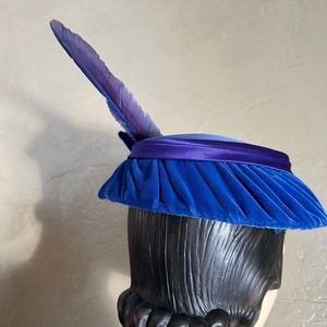 CHIC 1950's ROYAL BLUE VELVET & PURPLE SATIN DRAPED PANCAKE HAT WITH FEATHER