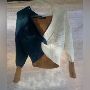 This twist knot color block sweater in teal, tan and cream is perfect for cooler weather!