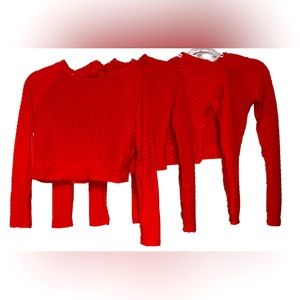 The long sleeve crop top & leggings have crisscross cutouts down the middle of the back & on the side of the waist.