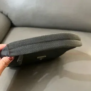 It features silver tone hardware , triangle metal tonal logo on front and logo plaque inside.