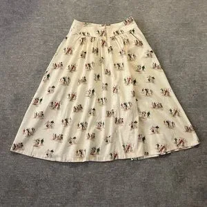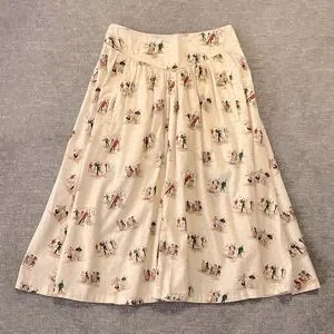 This vintage Lizsport skirt depicts old-fashioned skaters. It has a waistband with gathering. It has a back zipper. It is 100% cotton and in very good vintage condition. It has 2 front pockets. It is a very full skirt. It is not lined. Please check measurements as the skirt says size 10 but that is vintage sizing. A fun piece!