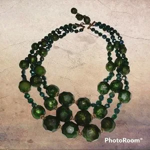 This is a gorgeous piece! Three strands of beautiful emerald green beads with iridescent teal crystal beads. Necklace measures about 17" at the longest strand. Perfect accessory for your holiday outfit!