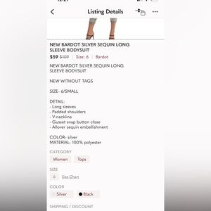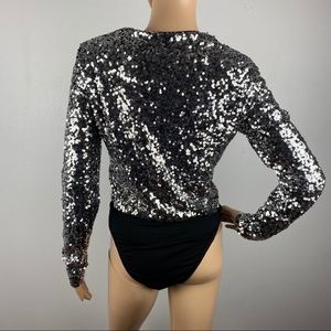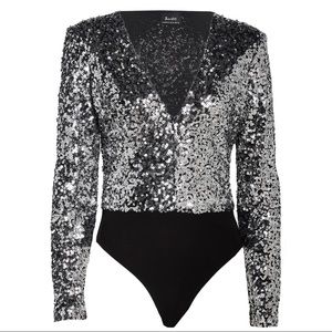 NEW BARDOT SILVER SEQUIN LONG SLEEVE BODYSUIT