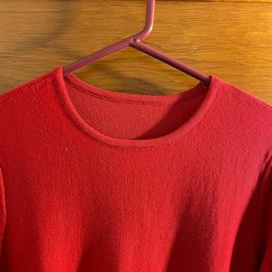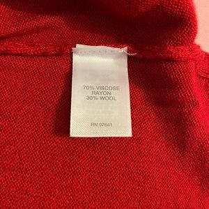 This rayon and wool blend sweater is a great weight for fall through spring. Styled with a flattering cut and mid-torso piecing detail, it has deep vents at the hem. (I removed the neck tag because it was uncomfortably scratchy.)