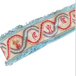 Featuring an authentic Valentino Garavani canvas snake & animal embroidered rock stud guitar strap in white canvas with blue fringe. Graphics include 2 weaving snakes along the length, and in between are various whimsical animal forms. Graphic in back is of 2 stripes. It is a breathtaking work of art to use as a strap on any style bag. Goosebumps!