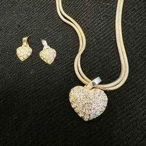 Fashion jewelry set from independent New Jersey brand Roman Jewelers❕Silver tone statement necklace and matching dangle earrings, with gem-encrusted heart charms. In very good, gently used condition with no flaws.