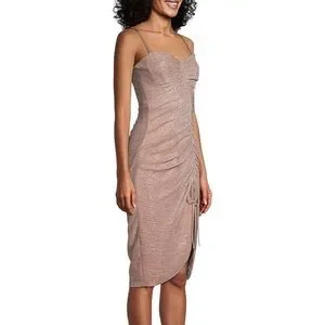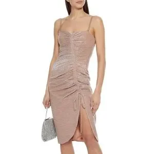 Ruching throws this slinky, shimmery rose-gold dress an extra curve from the bust right down to the leg-baring slit, and the adjustable straps are optional