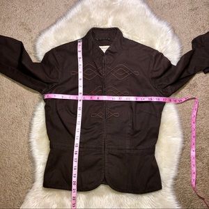 Anthropologie elevenses boho dark brown. military style jacket . Beautiful detail down the front of jacket with cute little clasps to close it. None missing. It is a very dark brown. Size 4. The sleeves can be worn cuffed or not. All flaws are pictured, slightly faded under arms and inside of collar, other than that great condition. Feel free to ask questions 🙂