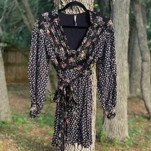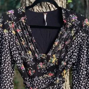 Adorable little calico FREE PEOPLE mini dress. Has long balloon sleeves, buttons up, removable tie waist, plunging v neckline, and mixed floral pattern. Love this little dress but my style has changed. Size XS. No flaws.