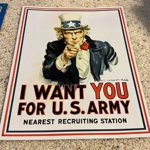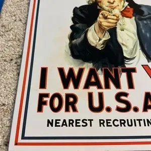 Price includes both of these metal signs. One is the classic “I want you” Uncle Sam sign and the other an Air Force sign. I have the measurements in the pics. I have pictures all the areas on each sign where there are imperfections, there are some scratches on both and the white one has a bit of very faint light orange to part of the white as shown. It almost looks like it goes with the image so it doesn’t take away from the sign itself