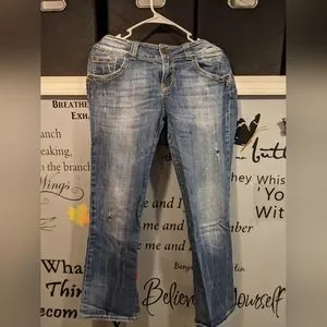 These are Y2K original, Dark Blue/faded, Low Rise Distressed jeans with Flared bottom. They look so good on, one of my favorite pairs ever, I just wish they still fit ☺️.