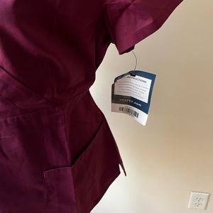 NWT Vestex Scrub Top. Maroon/darker purple color. V neck. 2 pockets. Adjustable tie back. Size L.
