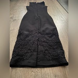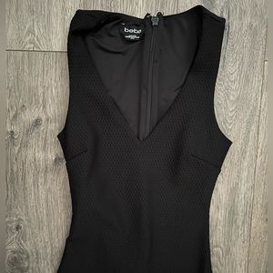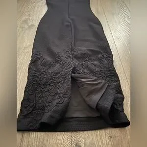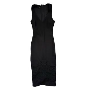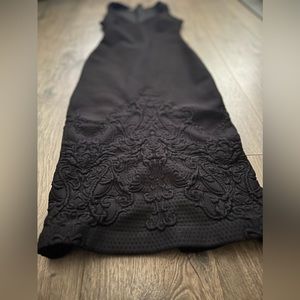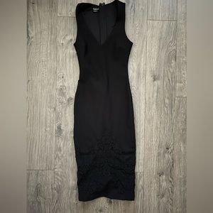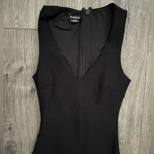 Bebe cocktail dress. XS. Deep v neckline. Stretchy material. Can fit a small-medium for a glove like fit. Beautiful detailed embroidery at the bottom. Small slit in the back. Zipper along backside.