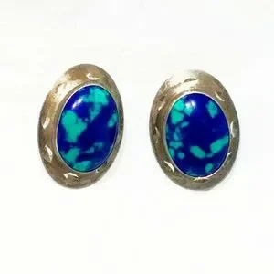 Gorgeous Vintage Azurite/Sterling Silver Native American Post Earrings. Large Azurite Cabachons set in Sterling Silver, with a diamond cut pattern surrounding the stones, which really makes these beauties stand out. Measure approximately 1" x .75". Hallmarked Sterling. Excellent vintage condition.