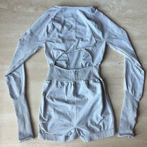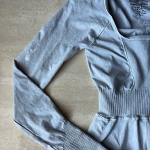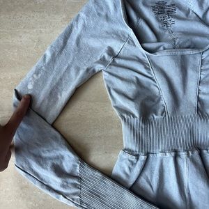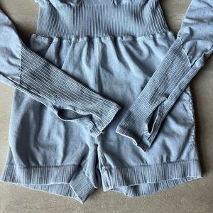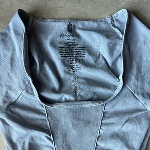 With an open back & rounded neckline this onesie from Free People makes for an effortless everyday fit, in the best selling Good Karma series. Long sleeves with a ribbed cuff & thumb holes. Color is ice gray. 7/8 length & such a flattering fit! Fabric has SPF 30 UV protection. Made in the USA