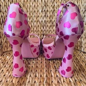 New in Box💕 Love Language platforms in Baby Pink Satin with all over metallic Hot pink hearts.💕✨Ankle strap has a rhinestone buckle and also a rhinestone gold chain strap dangles along side.