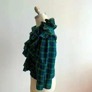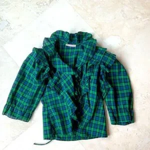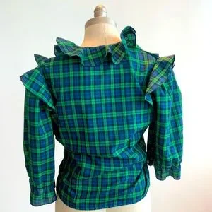Feminine, flattering, and timeless ruffled wrap top. Imagnin cotton, wash and wear top I think it’s a size 8-10 top, great with jeans skirt or a pair of jeans..simply been saving this cute top. Measurements are P2P 19.5”, length 20.t”, SL 16.5”