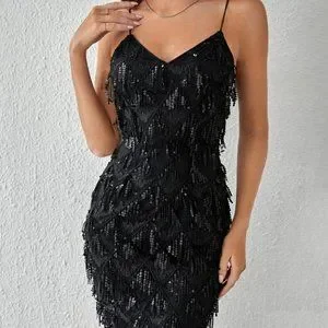 Black Preppy Womens Tall Fringe Trim Sequin Cami Dress