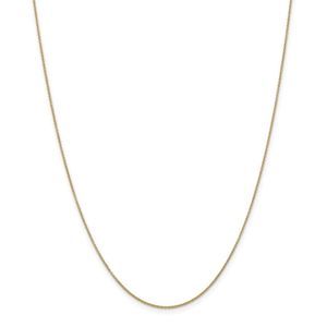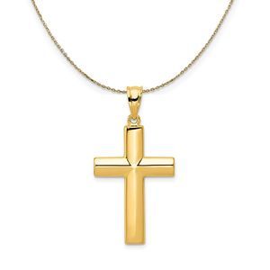 The 3-D hollow cross was crafted from 14 karat gold with a polished finish. Pendant measures approximately 18mm (11/16 inch) in width by 33mm (1 1/4 Inch) in length, which includes the tapered bail. Includes a 18 inch long, 0.9mm wide, solid 14k yellow gold cable chain with a spring ring clasp.