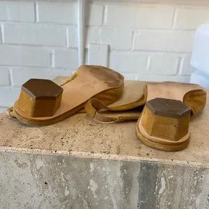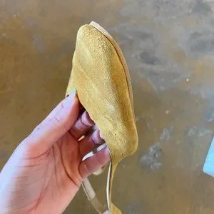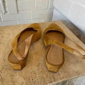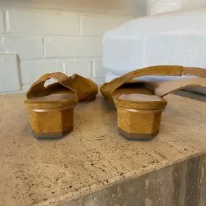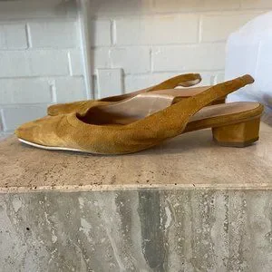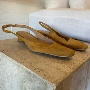 camel suede slingbacks with low, hexagonal shaped heel. good condition. some signs of wear around the front and sides of the toe box and the heel. obvious signs of wear on the sole. heel 2.5 cm. made in Spain.