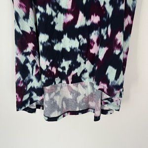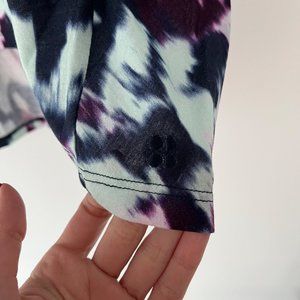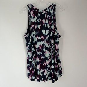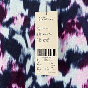 NWT Women's Sweaty Betty Easy Peazy blue flow print sustainable vest tank top, size 8-10. High neckline, high low hem, sleeveless. NWT– New with tags. Tie dye print.