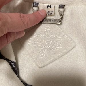 Joujou medium winter coat. Cream color with black lace lining. Double breasted with belt. In good condition. Needs to be dry cleaned