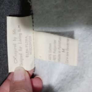 I believe it's fleece, dark grey, womens medium, zip front jacket with two front pockets. There are small flowers embroidered on the front.