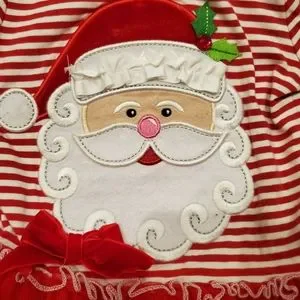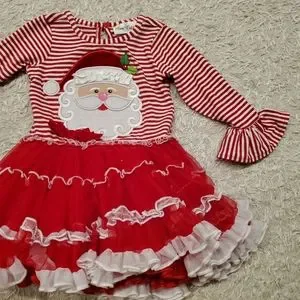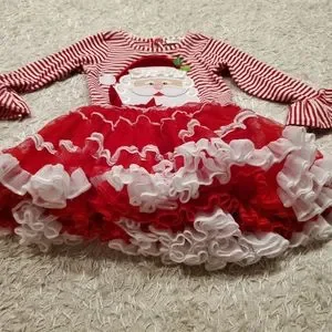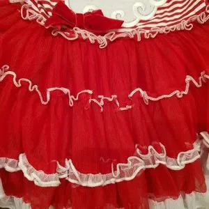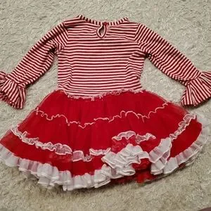 unique Santa Christmas dress. White and red stripes with ruffled skirt. The sleeves flare out