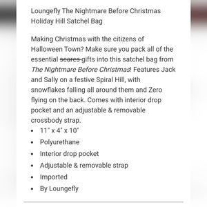 New Loungefly Nightmare before Christmas Holiday satchel featuring Jack and Sally and Zero. See pictures for more details and measurements.