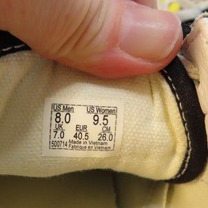 Nice shape, normal PRE OWNED wear, residual blemishes/markings on white trim at soles, see pics. Very mild fade in black suede at heels, see pics.