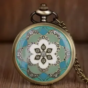 Gorgeous pocket watch features a stunning geometric floral design. Enamel and crystal inlay which has been coated with clear resin for a silky smooth finish. This is a beautiful, statement piece... the photos don't do it justice! Solid metal construction in an antique bronze finish.