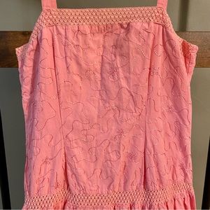 This is a beautiful dress. The color was hard to photograph but I’d say the full length pics are the closest. There are a couple of embroidery snags and one small stain. It has an underskirt. I couldn’t find a material tag but I’d say it’s a cotton or cotton blend. There is no stretch or sheen and it has some weight to it. Zipper in the back cinches you in and the skirt flows out.