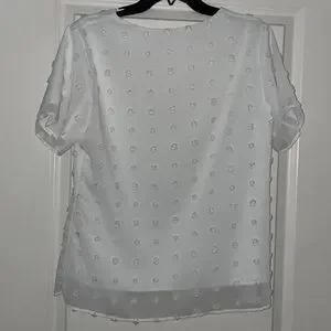 Super cute white polka dot textured Blooming Jelly top. Sheer overlay with a built in white liner. Great top for work or with jeans. Smoke free and pet free home.