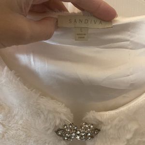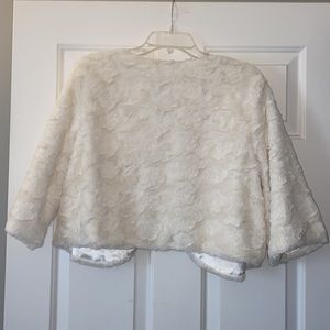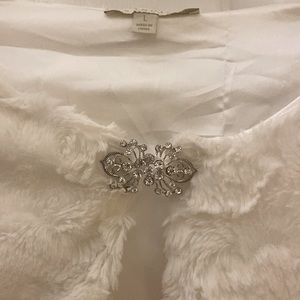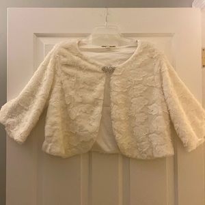 This beautiful cream colored jacket is a wonderful complement to any formal winter outing. Features a sparkly rhinestone brooch style clasp. 3/4 length sleeves.