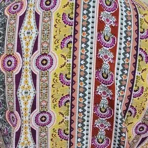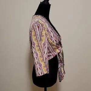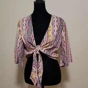 Ultra Flirt crop shirt with deep V cut neck line and front tie. Ok to wear as is ,with camisole or a bodycon outfit. 3/4 sleeve , 95% polyester and 5% spandex. Size large Multicolor design.