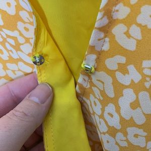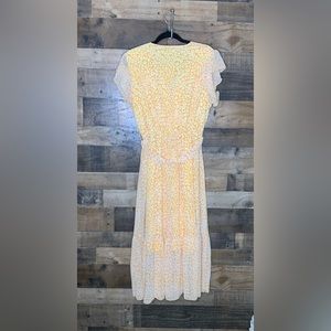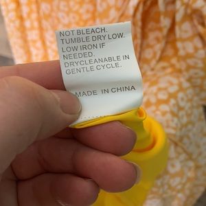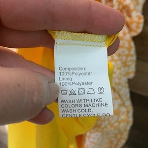 Brand new, lined, short sleeves, v-neck with a modesty snap, elastic waist with self tying/removable belt, and a ruffle at the bottom. This has white flowers all over a orangish/yellow background with yellow lining.