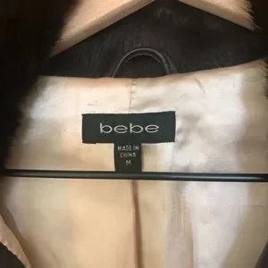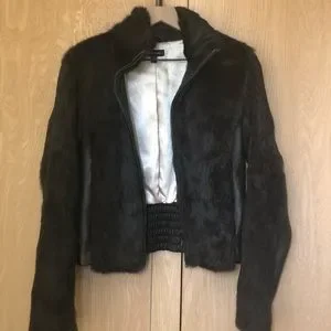 Super cute dark brown rabbit fur coat by Bebe. Leather side panels and gathered in the back for a flattering fit. It’s vintage but in excellent condition on the outside! The light pink lining has some brown marks (see photos) that could probably be removed with a dry cleaning. I purchased this coat at a vintage store so I’m not sure what the marks are but they didn’t bother me. 22” from top of should to bottom hem. 18” from underneath pit across bust.