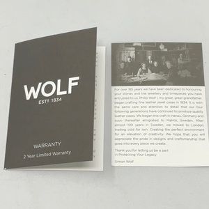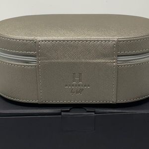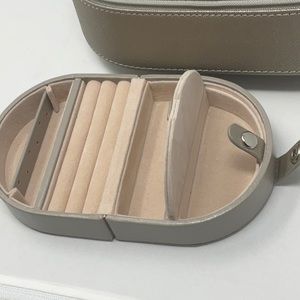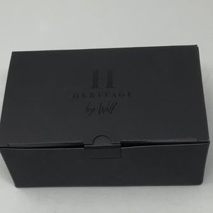 NIB Wolf Heritage Jewelry Box/travel case. It is a cute little jewelry box in its own right, but becomes even more handy if you like to travel with your jewelry. Don’t let your valuable jewelry flop around in your suitcase; organize it all here in this little package, and place it in your carry on or purse. The case is done is a textured pewter vegan leather, and is lined with a soft suede. There are 2 jewelry compartments, the bottom compartment is removable and forms it’s own travel case, which snaps closed, if you are taking less jewelry. There are 2 necklace holders, 4 ring rolls, and 6 earring holes. The box measures 7.75 inches long x 4.5 inches wide x 3 inches high.