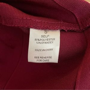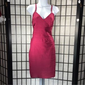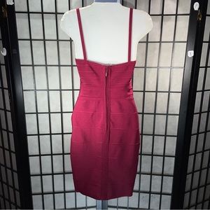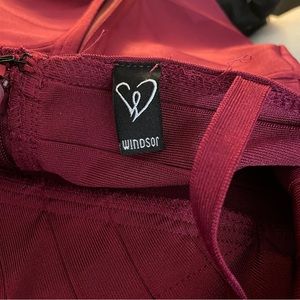 Ladies, maroon Bandage dress has a V-neck is knee length and sleeveless with a zipper back closure. It has spaghetti straps and is formfitting by Windsor size small.