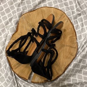 American Eagle. Strappy Sandler. Fabric is black velvety material. Zip up back. Flats. Adorable.