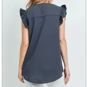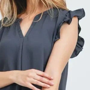 Grey Ruffle Sleeve Blouse. Fabulous wardrobe staple! Short ruffle sleeves. V neck. 100% polyester. Fit is true to size size. New boutique item.