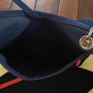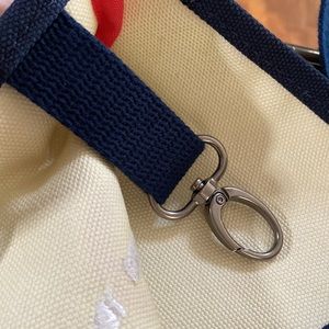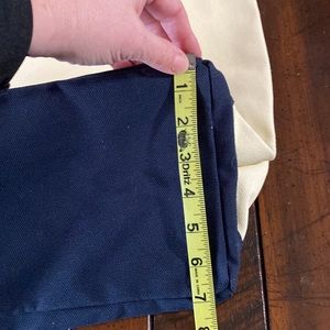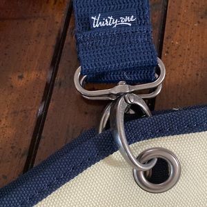 Thirty One Canvas Crew Tote. Open top with tie closure, one inside zipper pocket and one pocket that is open. Comes with one set of handles, but they do unhook and you can change the straps if you would like. Hook for Keys. This is pre-owned, it looks new!! Excellent condition. See photos for size.