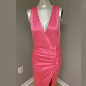 Fabric: Satin Racerback styling Side slit Ruching detail Solid-color design Maxi length V neck Sleeveless Exposed zip at back Hook-and-eye at neckline Partially lined Shell: 75% triacetate/25% polyester Lining: 94% polyester/6% elastane Dry clean Imported, China