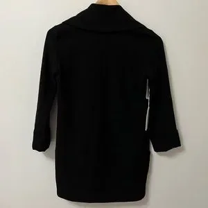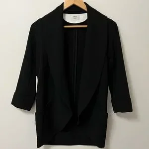 This is a tuxedo-inspired, open blazer with tacked three-quarter length sleeves. It’s made with a textural double-cloth crepe.