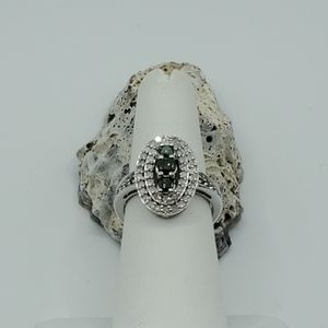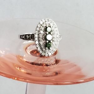 This stunning sterling ring features a total of 1.00 ctw of round brilliant cut white and fancy green diamonds. This gorgeous ring (purchased from an estate) was evaluated and verified by a GIA Graduate Gemologist, with diamond grading done under GIA standards. The primary stone dimensions ranged from 1.30-3.50mm individually, and ranged from I1-I3 in clarity. The ring is marked J925, and is in Excellent Used Condition. Please see all pictures for details, condition, and size comps.