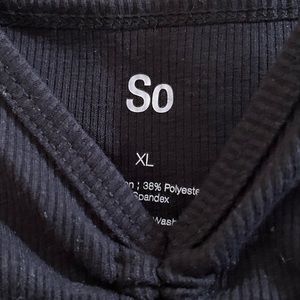 So Black Cropped Tank Top. Thin Straps, never worn. Tags taken off. Smoke Free Home. Can be adjusted with strings in front of tank top.